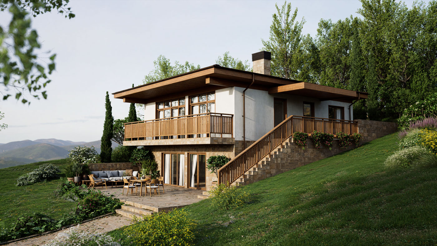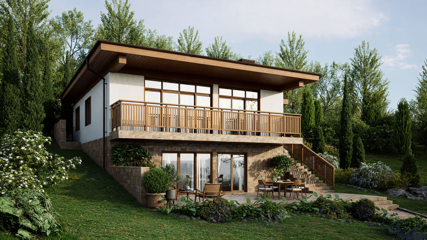 Этот архитектурный проект создан для участков, где рельеф, перепады высот и окружение требуют не типовых решений, а точной и продуманной работы с пространством. Дом органично вписывается в склон, превращая его в преимущество — за счёт многоуровневой композиции, террас и панорамных видов, которые раскрываются из жилых помещений.